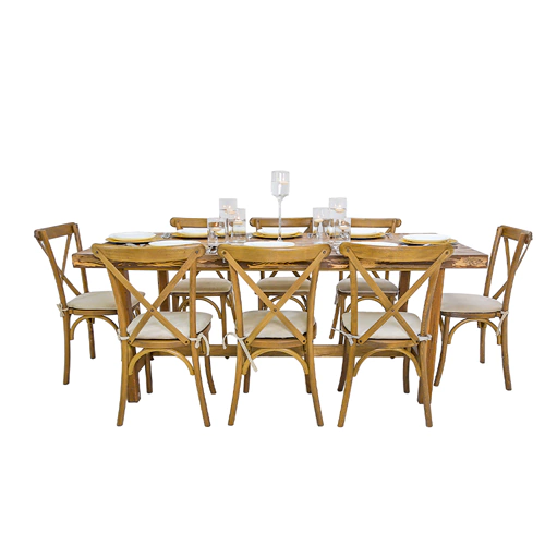 The lozoya rectangular table, for rent in Dubai and UAE, embodies the timeless luxury of wooden dining tables. A perfect choice for all outdoor events, weddings and family gatherings. Paired with wooden cross back chairs or gold Chiavari chairs, and dressed in table lighting decoration, it's in a league of its own